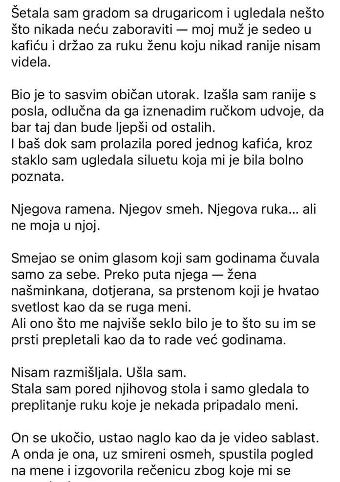 Prepoznala bih ga i u mraku. Njegov smeh, njegov način kako naginje glavu kad sluša.Ali nije sedeo sam. Preko puta njega — žena, nasmejana, doterana, s prstenom koji se blistao na pogrešnoj ruci. A njihovi prsti — isprepleteni.