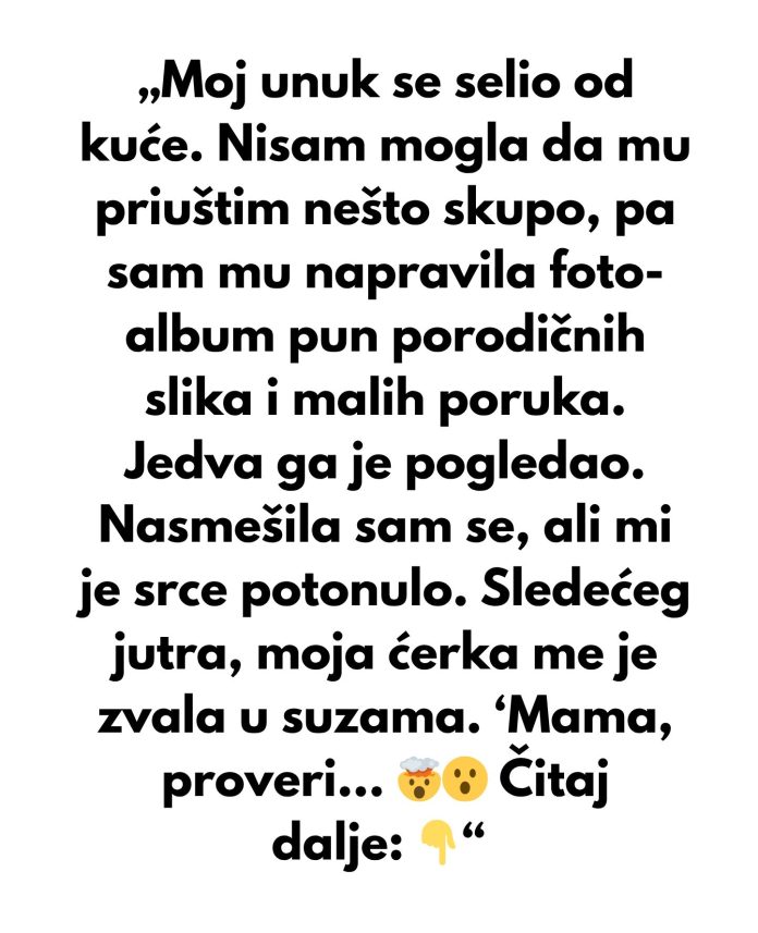Otvorila sam telefon i videla objavu mog unuka — sliku albuma, otvorenog na prvoj strani. Napisao je: „Ove stranice sadrže svaki deo onoga što jesam. Moja baka mi je dala moju istoriju, moje srce, moj dom. Ovo ću nositi sa sobom gde god da idem.“