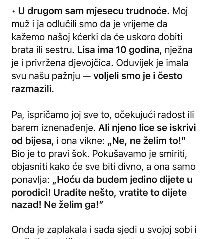 Pa, ispričamo joj sve to, očekujući radost ili barem iznenađenje. Ali njeno lice se iskrivi od bijesa, i ona vikne: „Ne, ne želim to!” Bio je to pravi šok. Pokušavamo je smiriti, objasniti kako će sve biti divno, a ona samo ponavlja: „Hoću da budem jedino dijete u porodici! Uradite nešto, vratite to dijete nazad! Ne želim ga!”