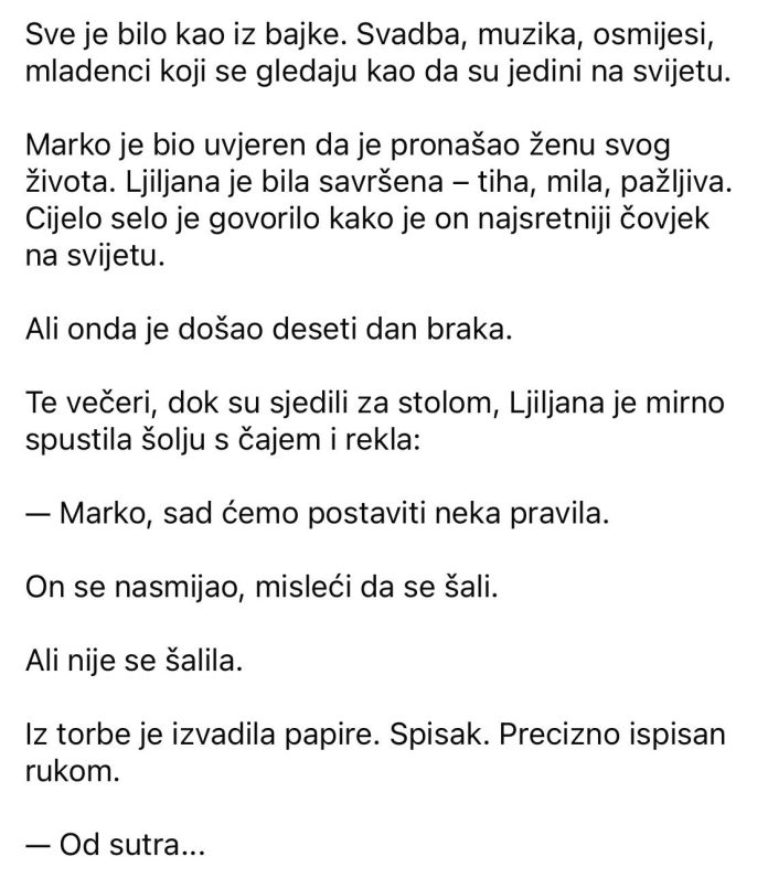Marko je bio uvjeren da je pronašao ženu svog života. Ljiljana je bila savršena – tiha, mila, pažljiva. Cijelo selo je govorilo kako je on najsretniji čovjek na svijetu.