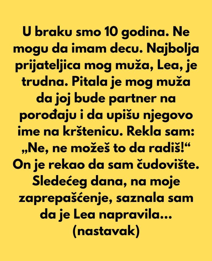 Lea je zatrudnela nakon kratke veze sa tipom koji je pobegao čim mu je rekla. Sada, nekoliko nedelja pre termina, tražila je od mog muža da joj bude porođajni partner. Već tada mi je bilo neprijatno, ali onda je usledio pravi šok: želi da on bude upisan na krštenicu.