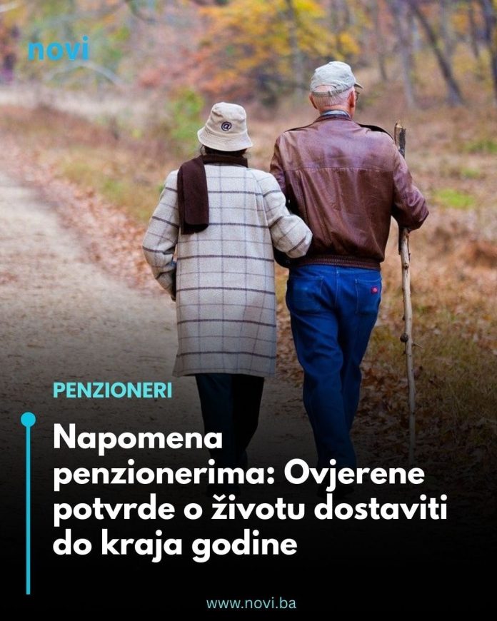 Federalni zavod za penzijsko/mirovinsko i invalidsko osiguranje obavještava sve penzionere sa prebivalištem van Federacije BiH (osim korisnika iz R. Srpske, R. Hrvatske, R. Slovenije, R. Srbije, R. Crne Gore i R. Sjeverne Makedonije) da su u obavezi do kraja 2025. godine poslati potvrdu o životu.