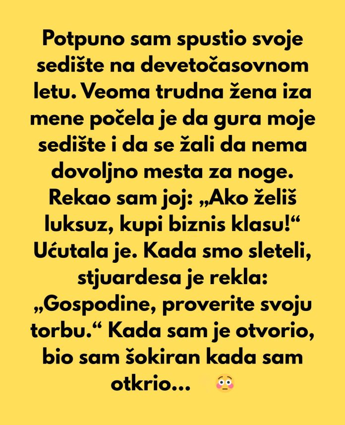 Potpuno sam spustio svoje sedište na devetočasovnom letu. Veoma trudna žena iza mene počela je da gura moje sedište i da se žali da nema dovoljno prostora za noge. Rekao sam joj: „Ako želite luksuz, kupite biznis klasu!“