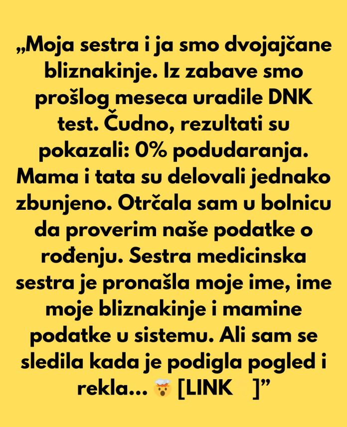 **„Moja sestra i ja smo dvojajčane bliznakinje. Iz čiste zabave uradile smo DNK test prošlog meseca. Čudno, rezultati su pokazali: 0% podudaranja. Mama i tata delovali su jednako zbunjeno. Rešena da dobijem odgovore, otrčala sam u bolnicu da proverim naše podatke o rođenju. Medicinska sestra je pronašla moje ime, ime moje sestre i mamine podatke u sistemu. Ali sam se sledila kada je zastala, pogledala me i rekla: ‘Obe ste rođene ovde, istog dana… ali u različitim porođajnim salama.’Sredstva za ciste