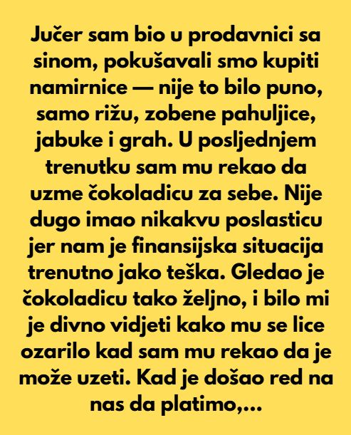 Tek što smo došli do auta, prišao nam je čovjek koji je stajao iza nas u redu, sa svojom djecom. Pružio mi je kese sa stvarima koje smo morali ostaviti u prodavnici — uključujući i tu čokoladicu — i rekao da je on sve platio. Rekao je i da je i sam bio u takvoj situaciji i da s vremenom bude bolje.