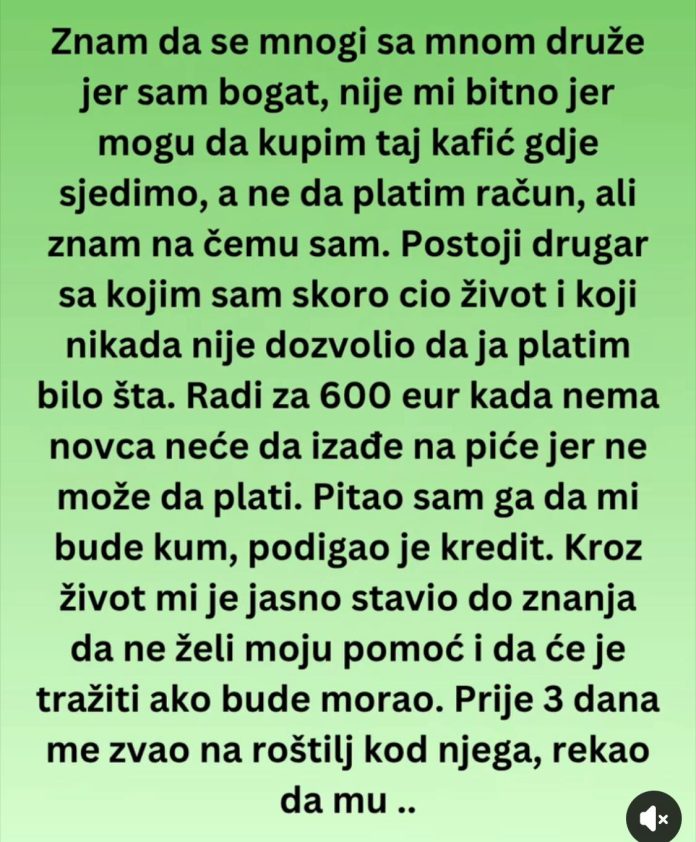 Znam da se mnogi sa mnom druže jer sam bogat, nije mi bitno jer mogu da kupim taj kafić gdje sjedimo, a ne da platim račun, ali znam na čemu sam. Postoji drugar sa kojim sam skoro cio život i koji nikada nije dozvolio da ja platim bilo šta. Radi za 600 eura i kada nema novca neće da izađe na piće jer ne može da plati. Pitao sam ga da mi bude kum, podigao je kredit. Kroz život mi je jasno stavio do znanja da ne želi moju pomoć i da će je tražiti ako bude morao.