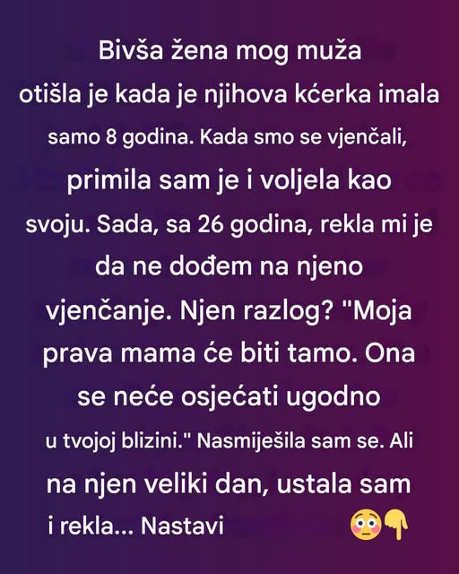 Međutim, jednog dana mi je saopštila da ne želi da prisustvujem venčanju. Objasnila je da će njena biološka majka biti prisutna i da želi da izbegne neprijatne situacije. Te reči su me pogodile, ali sam odlučila da ostanem smirena i poštujem njenu odluku.