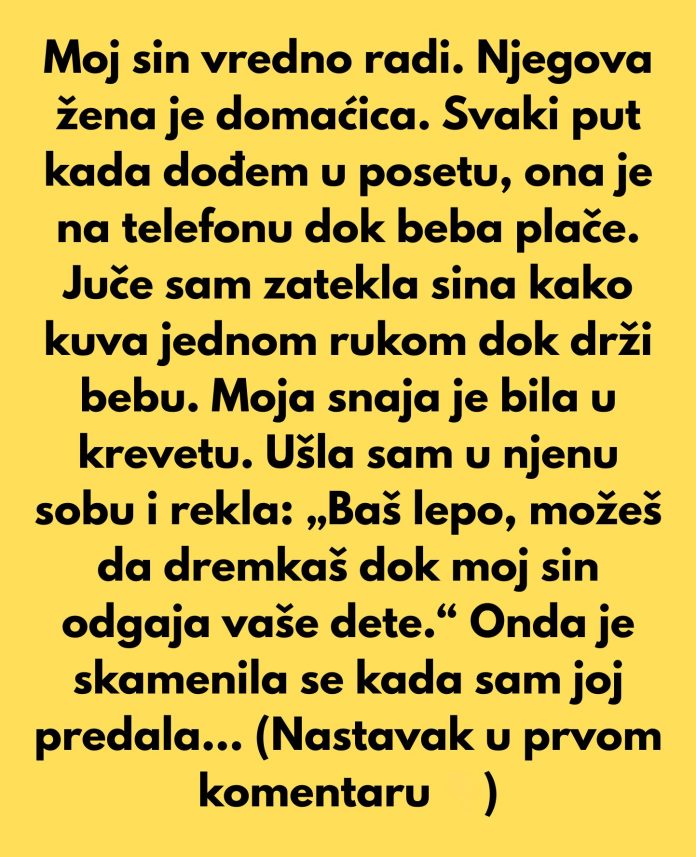 Moj sin se vrati kući iscrpljen, samo da bi čistio nered koji je ona ostavila. A prošlog vikenda je bila kap koja je prelila čašu. Kada sam ušla, sin je držao bebu jednom rukom i pokušavao da spremi večeru za sebe i snaju drugom. A ona—uvijena u krevetu, gleda Netflix.