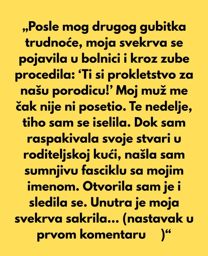 „Posle mog drugog gubitka trudnoće, moja svekrva se pojavila u bolnici i kroz zube rekla: ‘Ti si prokletstvo za našu porodicu.’ Moj muž me čak nije ni posetio. Te nedelje sam spakovala svoje stvari i tiho se vratila u kuću svojih roditelja.