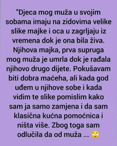 Znala sam da će to biti težak razgovor. Znala sam koliko mu te uspomene znače. Znala sam i koliko djeci znači da imaju osjećaj da je njihova majka i dalje „tu“. Ali znala sam i koliko sam ja dala ovoj porodici, koliko sam uložila ljubavi, snage i strpljenja. I koliko mi je važno da osjetim da ovdje pripadam, a ne da samo postojim.