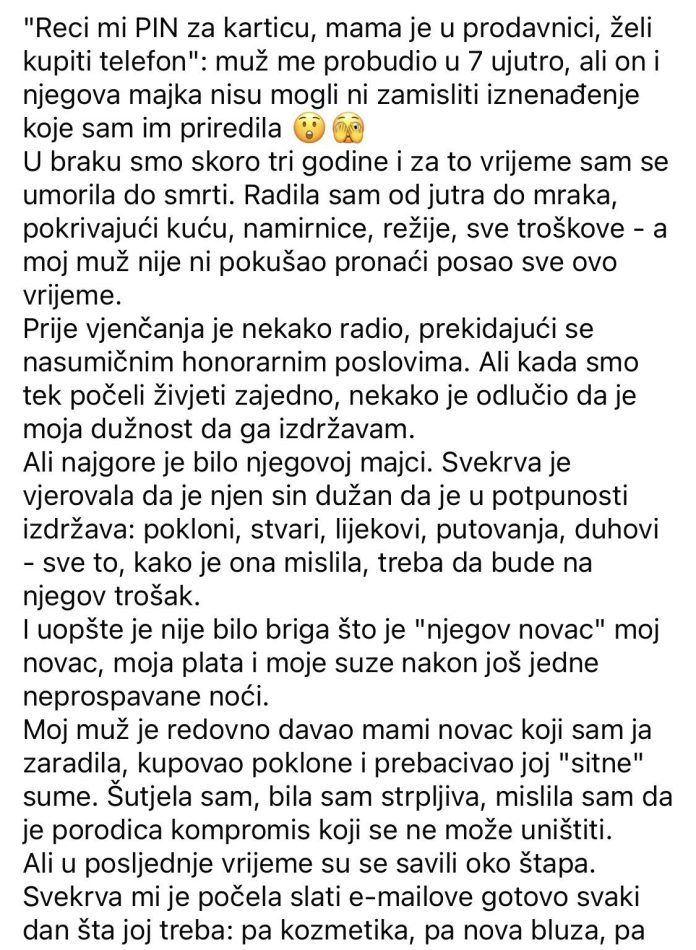Pored nedostatka podrške od supruga, dodatni teret stvarala je njegova majka, koja je očekivala da joj snajka finansira svakodnevne potrebe, kupovine i želje. Kada se zahtevi ponavljaju svakodnevno, a pri tome dolaze bez ikakve zahvalnosti ili razumevanja, stvara se nezdrava dinamika.