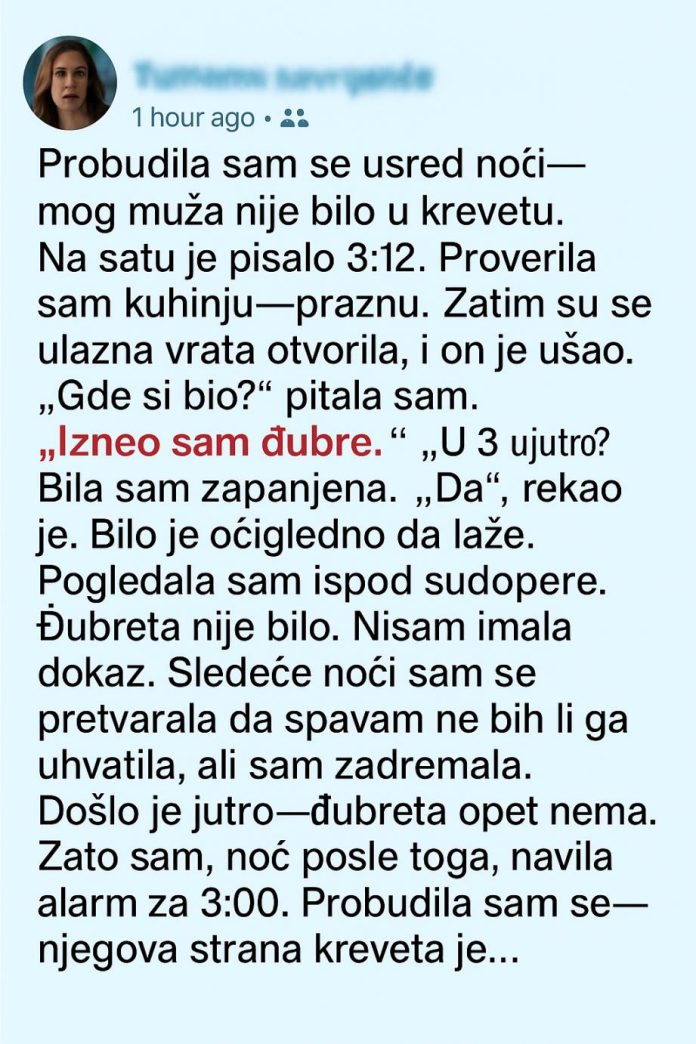 Brakovi se vremenom menjaju. Mnogi se nadaju da će dugogodišnja zajednica postati stabilna luka, mesto sigurnosti i poverenja. Ali ponekad, baš u trenucima kada verujemo da sve funkcioniše, ispod površine počnu da se gomilaju tihe pukotine. Ova priča govori o tome kako se neobična sitnica – iznošenje smeća u tri ujutru – pretvorila u početak velikog razotkrivanja.
