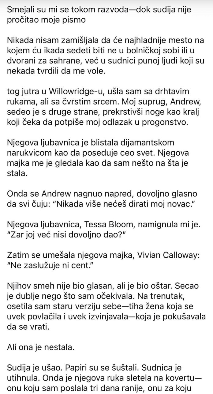 Sa druge strane sudnice, moj razvedeni suprug, Andrew Calloway, sedeo je opušteno, kao da je vlasnik cele zgrade. Prekrstio je noge i uperio u mene onaj svoj samouvereni osmeh, koji je izazivao mučninu u stomaku. Njegova izjava odjeknula je prostorijom: