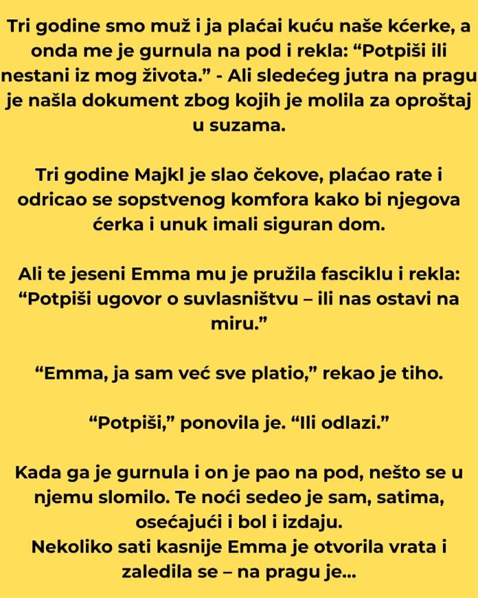 Ali te jeseni Emma mu je pružila fasciklu i rekla: “Potpiši ugovor o suvlasništvu – ili nas ostavi na miru.” “Emma, ja sam već sve platio,” rekao je tiho.