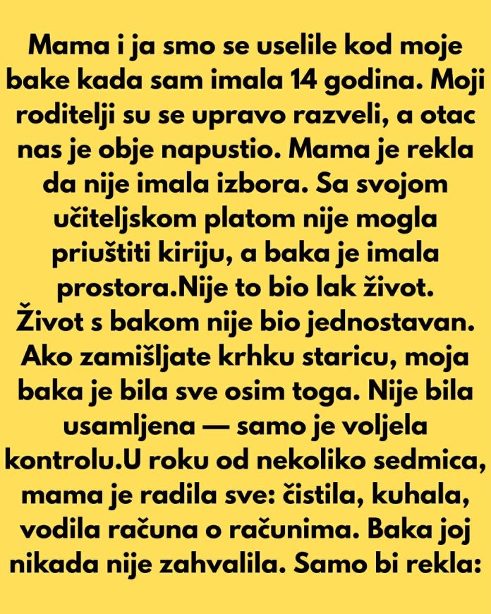 Život s bakom nije bio jednostavan. Ako zamišljate krhku staricu, moja baka je bila sve osim toga. Nije bila usamljena — samo je voljela kontrolu.U roku od nekoliko sedmica, mama je radila sve: čistila, kuhala, vodila računa o računima. Baka joj nikada nije zahvalila. Samo bi rekla: „To je dužnost kćerki.“