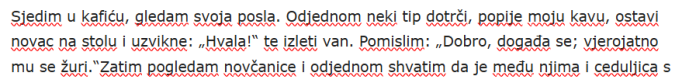 Sjedim u kafiću, gledam svoja posla. Odjednom neki tip dotrči, popije moju kavu, ostavi novac na stolu i uzvikne: