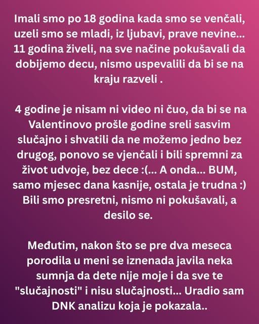 Međutim, nakon što se pre dva meseca porodila u meni se iznenada javila neka sumnja da dete nije moje i da sve te “slučajnosti” i nisu slučajnosti… Uradio sam DNK analizu koja je pokazala da ipak jesam otac…