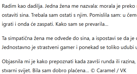 Radim kao dadilja. Jedna žena me nazvala: morala je preko noći u bolnicu posjetiti majku i nije imala kome ostaviti sina. Trebala sam ostati s njim. Pomislila sam: u čemu je problem… nahranit ću ga, malo ćemo se igrati i onda će zaspati. Kako sam se prevarila…Ta simpatična žena me odvede do sina, a ispostavi se da je on 25-godišnjak. Ne, ne traži mu mladenku. Jednostavno je strastveni gamer i ponekad se toliko udubi u igru da čak zaboravi jesti.