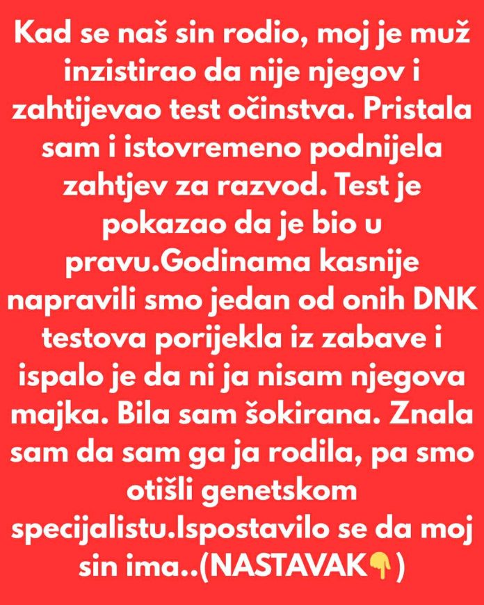 Kad se naš sin rodio, moj je muž inzistirao da nije njegov i zahtijevao test očinstva. Pristala sam i istovremeno podnijela zahtjev za razvod. Test je pokazao da je bio u pravu.Godinama kasnije napravili smo jedan od onih DNK testova porijekla iz zabave i ispalo je da ni ja nisam njegova majka. Bila sam šokirana. Znala sam da sam ga ja rodila, pa smo otišli genetskom specijalistu.Ispostavilo se da moj sin ima rijetko stanje koje se zove himerizam, što znači da ima dva različita DNK sklopa. To stanje može poremetiti testove očinstva.