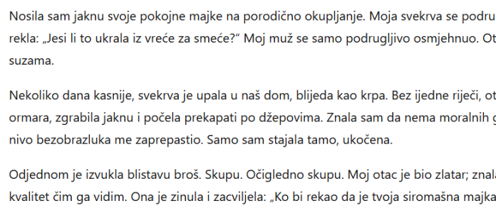Nisam imala pojma šta se dešava. Onda je istina izašla na vidjelo. Moj muž je vidio njeno ponašanje na okupljanju i napokon mu je prekipjelo — tiho. Kasnije joj je usput, sasvim nonšalantno, spomenuo da je moja majka zapravo bila bogata, samo je živjela skromno, i da je jakna koju sam nosila „neprocjenjive vrijednosti“.