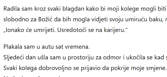 Radila sam kroz svaki blagdan kako bi moji kolege mogli biti sa svojim obiteljima. Kad sam zamolila slobodno za Božić da bih mogla vidjeti svoju umiruću baku, moj voditelj je rekao: