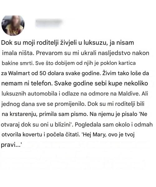 Jednog dana, dok su bili odsutni, dobila sam pismo s porukom da ga otvorim samo kada sam sama. U pismu se nalazila informacija koja je mogla potpuno promijeniti moj život i dati mi priliku da konačno riješim svoju finansijsku situaciju.