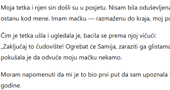 „Zaključaj to čudovište! Ogrebat će Samija, zaraziti ga glistama! Neka bude zatvorena u kupatilu!“ — i pokušala je da odvuče moju mačku nekamo.