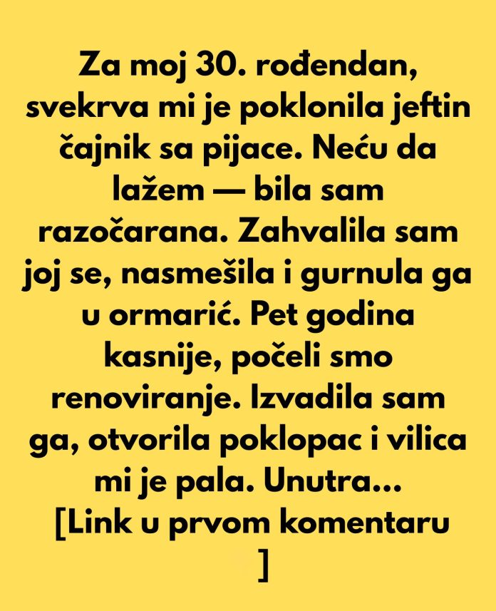 Za moj 30. rođendan, svekrva mi je poklonila jeftin čajnik sa pijace. Neću da lažem — bila sam razočarana. Zahvalila sam joj se, nasmešila i gurnula ga u ormarić.