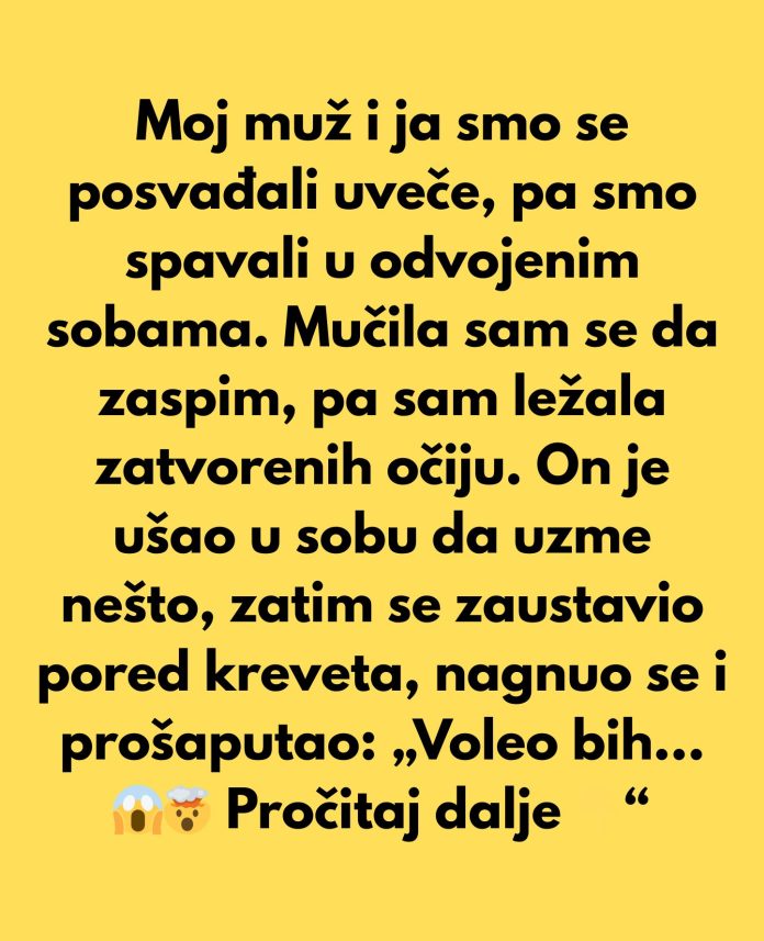 Moj muž i ja smo se posvađali noću, pa smo spavali u odvojenim sobama. Mučila sam se da zaspim, pa sam ležala zatvorenih očiju. Ušao je u sobu da uzme nešto, zatim se zaustavio pored kreveta, nagnuo se i prošaputao: „Voleo bih da se nikada nismo venčali.“