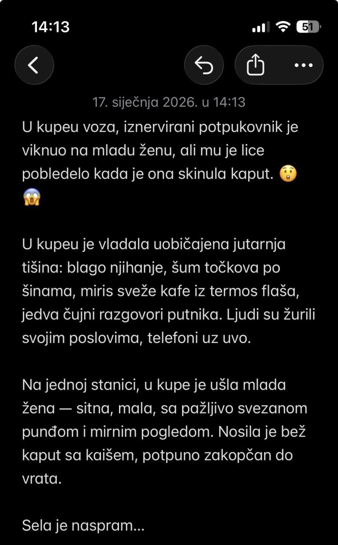 Ona je klimnula glavom, ne odgovarajući, i sišla na sledećoj stanici, ostavljajući vagon u napetoj tišini. Putnici su razmenjivali poglede, a potpukovnik je ostao sam sa svojim mislima, prvi put dugo shvativši da se pravi respekt prema drugima ne pokazuje vikanjem, već pažnjom i proverom činjenica.