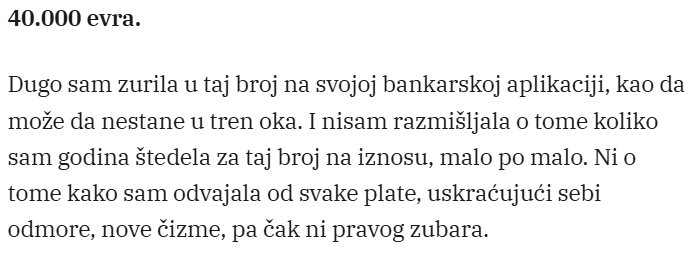 Podigao sam novac sa računa. Onih istih 40.000 evra. Uplatila sam sebi banju. Dobre skupe tretmane, iste one o kojima sam maštala poslednjih pet godina, ali sam se svega toga odricala.