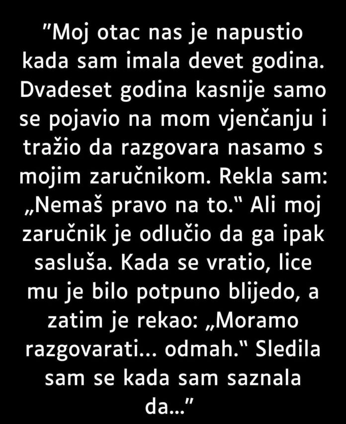 Rekao sam: „Nemaš pravo na to.“ Ali moj zaručnik ga je ipak saslušao. Kada se vratio, lice mu je bilo blijedo, a zatim je rekao: „Moramo razgovarati… odmah.“