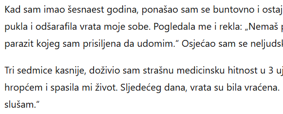 Kad sam imao šesnaest godina, ponašao sam se buntovno i ostajao vani do zore. Moja maćeha je na kraju pukla i odšarafila vrata moje sobe. Pogledala me i rekla: „Nemaš pravo na vrata jer nisi osoba; ti si samo parazit kojeg sam prisiljena da udomim.“ Osjećao sam se neljudski.