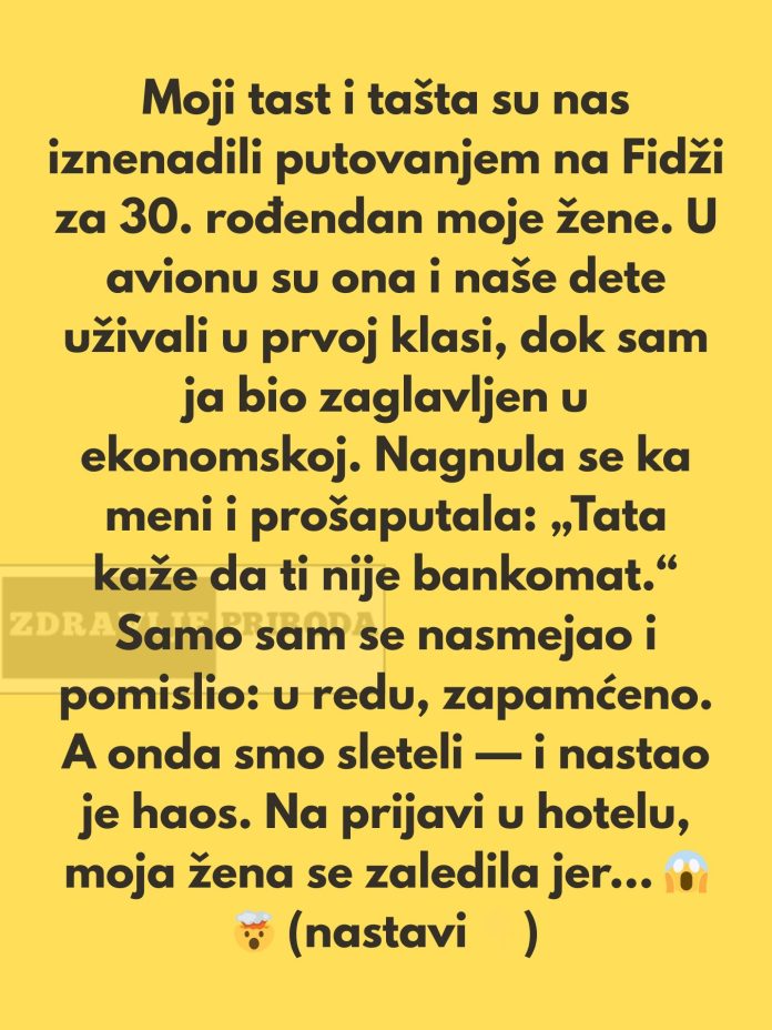 Dakle, moji svekar i svekrva su nas iznenadili putovanjem na Fidži za 30. rođendan moje žene. U avionu sam primetio da ona i naše dete uživaju u prvom razredu dok sam ja zaglavio u ekonomskoj klasi. Nagnula se i šapnula: „Tata kaže da nije tvoj bankomat.“ Samo sam se nasmejao i pomislio, u redu, zabeleženo.