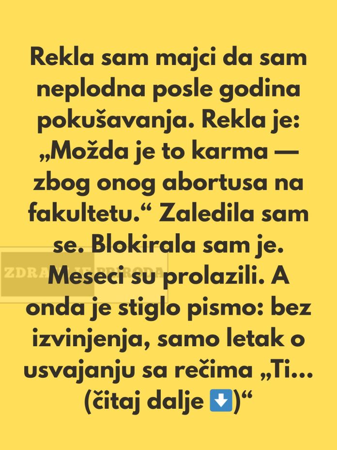 Dijagnostikovana mi je neplodnost posle godina pokušavanja. Slomilo me je. Konačno sam se otvorila majci, nadajući se utehi. Rekla je: