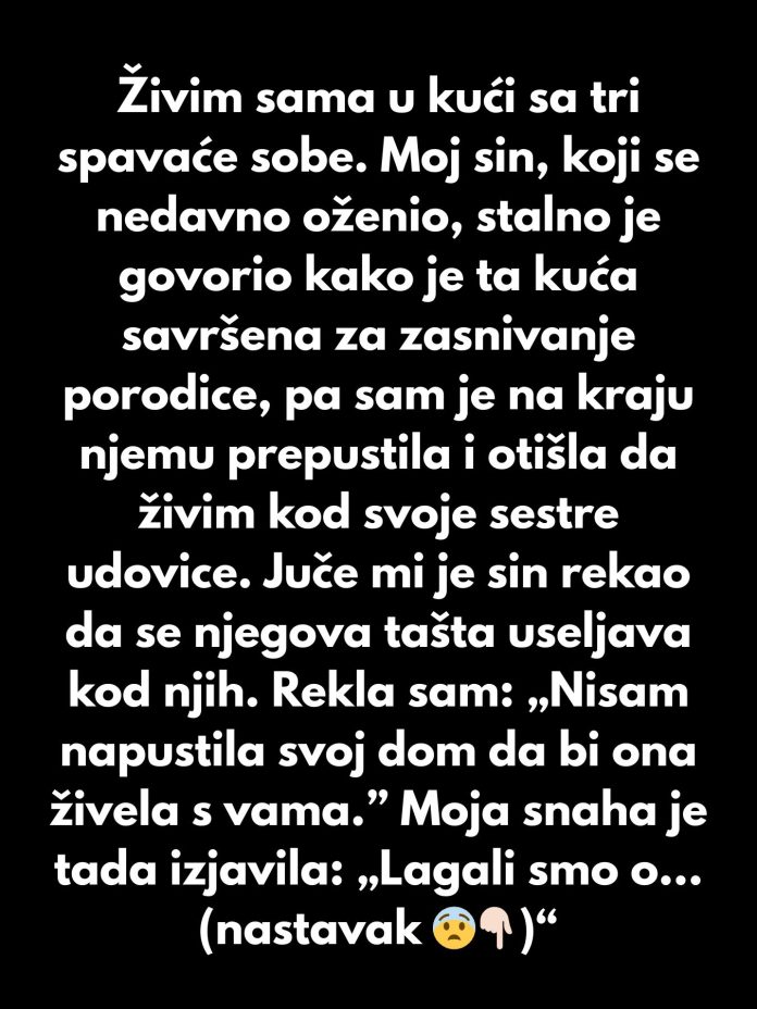 Živim sama u kući sa tri spavaće sobe. Moj sin, koji se nedavno oženio, stalno je govorio da je to savršena kuća za osnivanje porodice, pa sam je na kraju prepustila njima, a ja sam otišla da živim kod svoje sestre udovice.