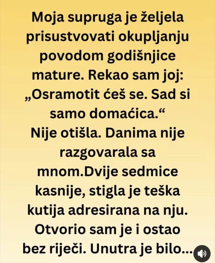 Dvije sedmice kasnije, stigla je teška kutija adresirana na nju. Otvorio sam je i ostao bez riječi. Unutra je bila uokvirena fotografija cijelog njenog razreda s mature, potpisana od svih.