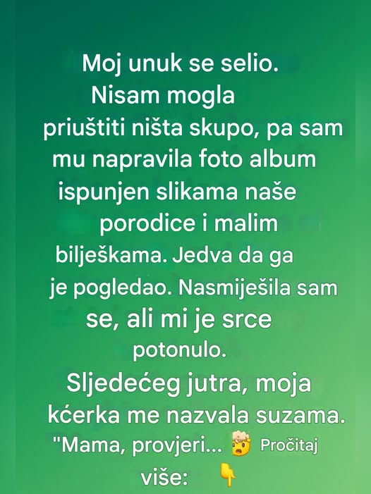 Kada sam mu album predala na dan selidbe, jedva da ga je otvorio. Pogledao je korice, promrmljao brzo „Hvala, bako“ i vratio se pakovanju stvari. Te noći sam sedela sama, pitajući se da li album uopšte znači nešto za njega… ili je samo još jedan podsetnik da svet u koji ulazi više nema mnogo mesta za mene.