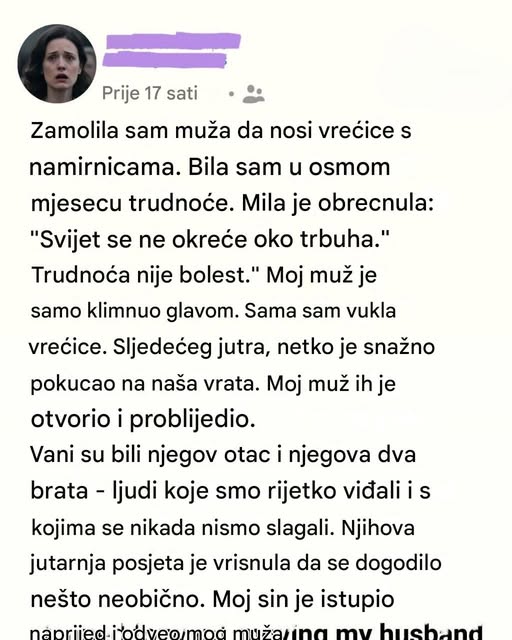 Vjerovala sam da je razumno zatražiti pomoć. Ne samo zbog trudnoće, već zato što sam brak uvijek doživljavala kao prostor uzajamne podrške. Moj suprug je, međutim, stajao na vratima, neodlučan. Prije nego što je išta rekao, iz kuhinje se začuo glas njegove majke. Rekla je da trudnoća nije bolest i da se svijet ne prilagođava pojedinačnim okolnostima.