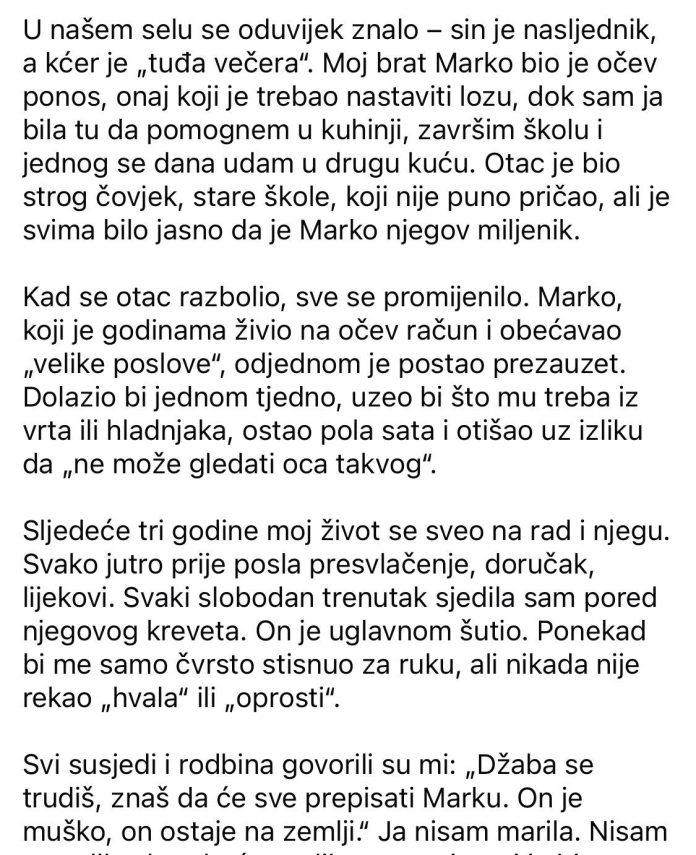 U našem selu se oduvijek znalo – sin je nasljednik, a kćer je „tuđa večera“. Moj brat Marko bio je očev ponos, onaj koji je trebao nastaviti lozu, dok sam ja bila tu da pomognem u kuhinji, završim školu i jednog se dana udam u drugu kuću. Otac je bio strog čovjek, stare škole, koji nije puno pričao, ali je svima bilo jasno da je Marko njegov miljenik.