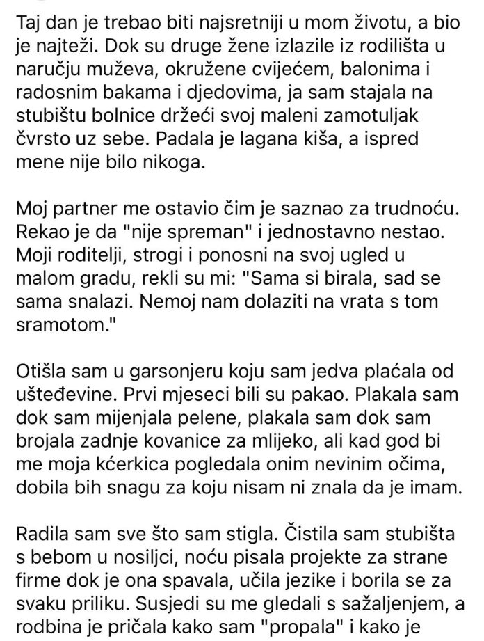 Otišla sam u garsonjeru koju sam jedva plaćala od ušteđevine. Prvi mjeseci bili su pakao. Plakala sam dok sam mijenjala pelene, plakala sam dok sam brojala zadnje kovanice za mlijeko, ali kad god bi me moja kćerkica pogledala onim nevinim očima, dobila bih snagu za koju nisam ni znala da je imam.