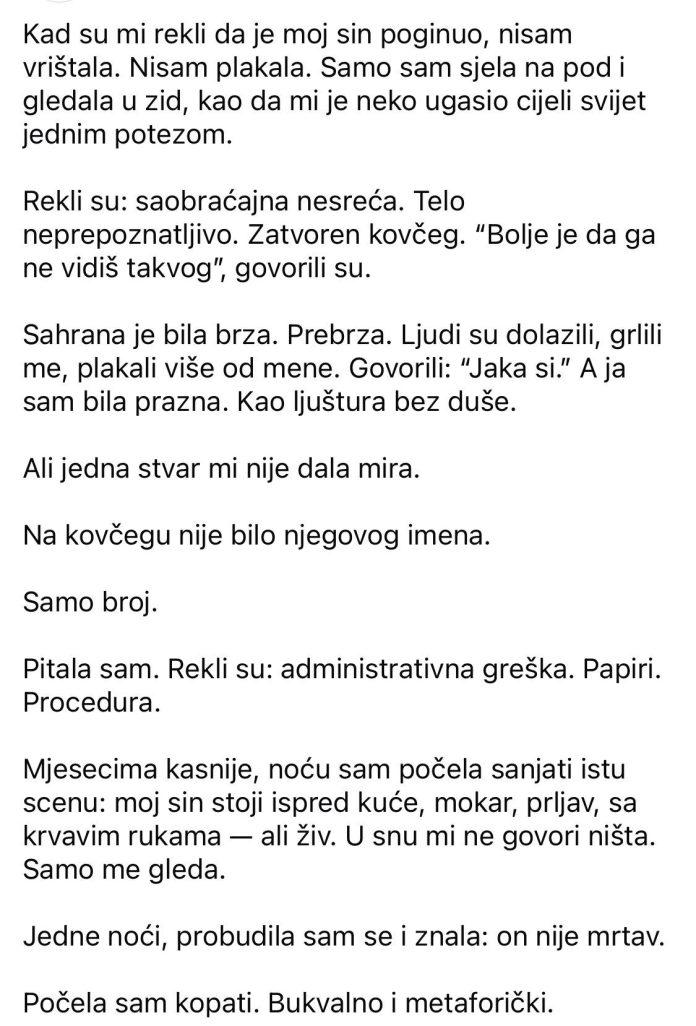 Kad su mi rekli da je moj sin poginuo, nisam vrištala. Nisam plakala. Samo sam sjela na pod i gledala u zid, kao da mi je neko ugasio cijeli svijet jednim potezom. Rekli su: saobraćajna nesreća. Telo neprepoznatljivo. Zatvoren kovčeg. “Bolje je da ga ne vidiš takvog”, govorili su. Sahrana je bila brza. Prebrza. Ljudi su dolazili, grlili me, plakali više od mene. Govorili: “Jaka si.” A ja sam bila prazna. Kao ljuštura bez duše. Ali jedna stvar mi nije dala mira. Na kovčegu nije bilo njegovog imena.