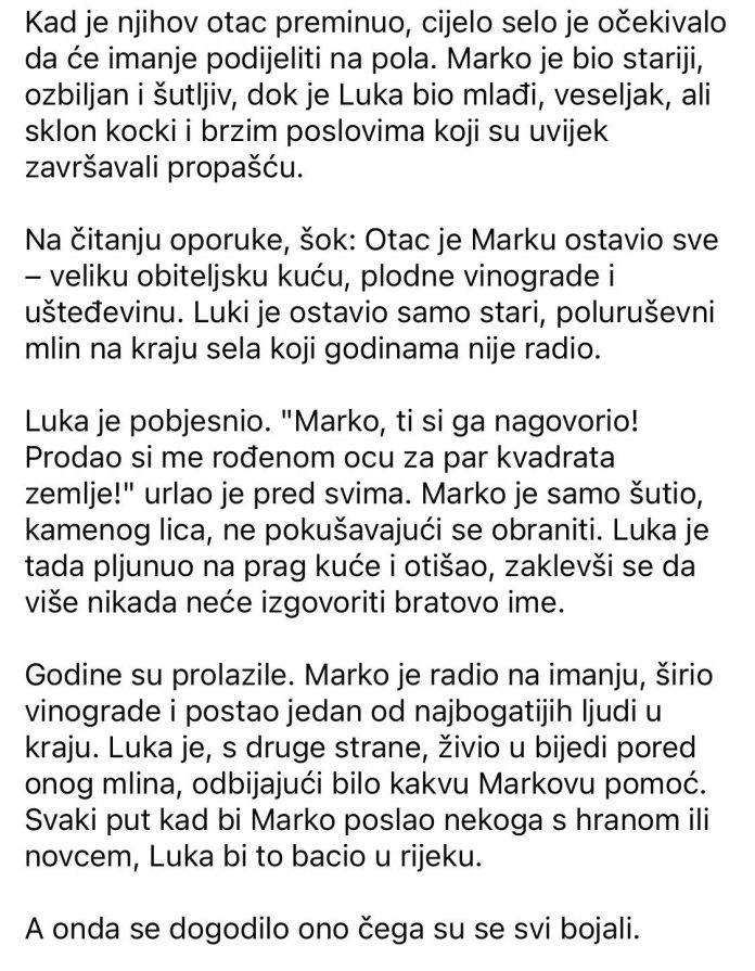 Luka je pobjesnio. “Marko, ti si ga nagovorio! Prodao si me rođenom ocu za par kvadrata zemlje!” urlao je pred svima. Marko je samo šutio, kamenog lica, ne pokušavajući se obraniti. Luka je tada pljunuo na prag kuće i otišao, zaklevši se da više nikada neće izgovoriti bratovo ime. Godine su prolazile. Marko je radio na imanju, širio vinograde i postao jedan od najbogatijih ljudi u kraju. Luka je, s druge strane, živio u bijedi pored onog mlina, odbijajući bilo kakvu Markovu pomoć. Svaki put kad bi Marko poslao nekoga s hranom ili novcem, Luka bi to bacio u rijeku. A onda se dogodilo ono čega su se svi bojali.