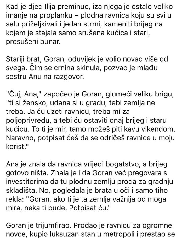 Kad je djed Ilija preminuo, iza njega je ostalo veliko imanje na proplanku – plodna ravnica koju su svi u selu priželjkivali i jedan strmi, kameniti brijeg na kojem je stajala samo srušena kućica i stari, presušeni bunar. Stariji brat, Goran, oduvijek je volio novac više od svega. Čim se crnina skinula, pozvao je mlađu sestru Anu na razgovor. “Čuj, Ana,” započeo je Goran, glumeći veliku brigu, “ti si žensko, udana si u gradu, tebi zemlja ne treba. Ja ću uzeti ravnicu, treba mi za poljoprivredu, a tebi ću ostaviti onaj brijeg i staru kućicu. To ti je mir, tamo možeš piti kavu vikendom. Naravno, potpisat ćeš da se odričeš ravnice u moju korist.” Ana je znala da ravnica vrijedi bogatstvo, a brijeg gotovo ništa. Znala je i da Goran već pregovara s investitorima da tu plodnu zemlju proda za gradnju skladišta. No, pogledala je brata u oči i samo tiho rekla: “Goran, ako ti je ta zemlja važnija od moga mira, neka ti bude. Potpisat ću.”