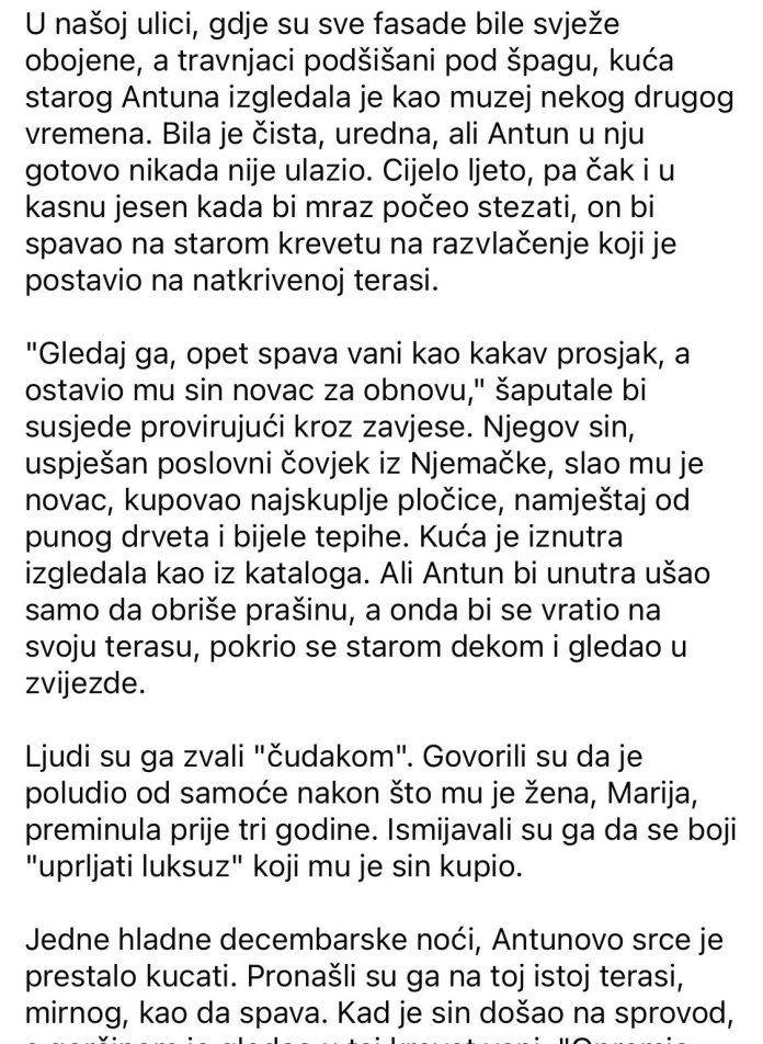 Jedne hladne decembarske noći, Antunovo srce je prestalo kucati. Pronašli su ga na toj istoj terasi, mirnog, kao da spava. Kad je sin došao na sprovod, s gorčinom je gledao u taj krevet vani. “Opremio sam mu kuću kao dvorac, a on je izabrao spavati u blatu,” ljutito je rekao obiteljskom liječniku dok su sjedili u toj sterilno čistoj dnevnoj sobi. Stari liječnik je polako spustio šalicu čaja, uzeo jedan mali ključ s vitrine i otvorio ladicu starog komoda koji je jedini ostao iz “prošlog života” prije renovacije. Izvadio je pismo koje je Antun ostavio. Pisalo je:
