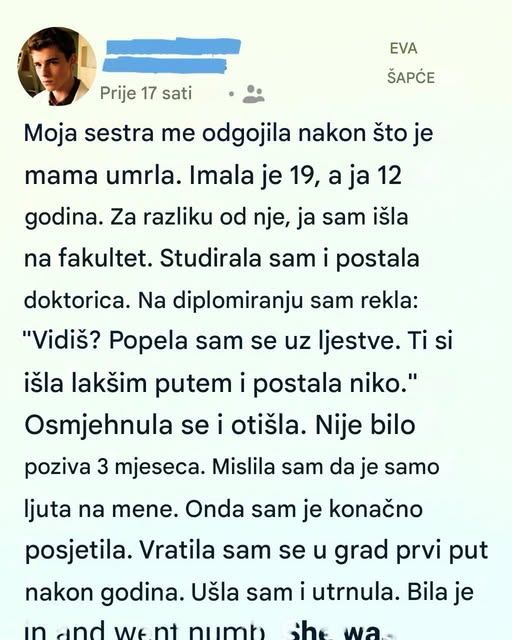 Njegov uspjeh, titule i diplome, bili su zasnovani na njenim mukotrpnim žrtvama, a on to nije prepoznao. Tek kada je zatekao sestru u bolnici, iscrpljenu i bolestnu, shvatio je istinu: sav novac i sredstva za njegov život dolazili su od nje, a ona je godinama tiho nosila teret oba života.