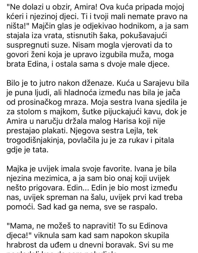 “Ne dolazi u obzir, Amira! Ova kuća pripada mojoj kćeri i njezinoj djeci. Ti i tvoji mali nemate pravo na ništa!” Majčin glas je odjekivao hodnikom, a ja sam stajala iza vrata, stisnutih šaka, pokušavajući suspregnuti suze. Nisam mogla vjerovati da to govori ženi koja je upravo izgubila muža, moga brata Edina, i ostala sama s dvoje male djece.Obiteljske igre