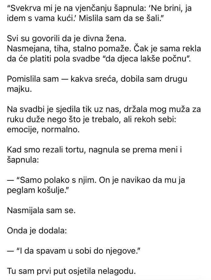 “Svekrva mi je na vjenčanju šapnula: ‘Ne brini, ja idem s vama kući.’ Mislila sam da se šali.”