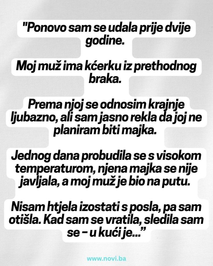 “Ponovo sam se udala prije dvije godine. Moj muž ima kćerku iz prethodnog braka. Prema njoj se odnosim krajnje ljubazno, ali sam jasno rekla da joj ne planiram biti majka. Jednog dana probudila se s visokom temperaturom, njena majka se nije javljala, a moj muž je bio na putu.