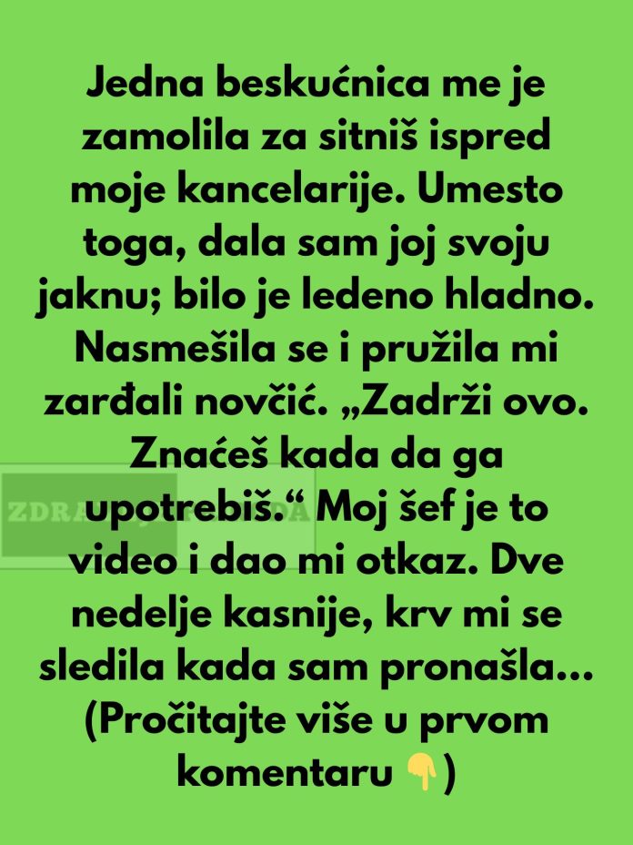 Jedna beskućnica me je zamolila za sitniš ispred moje kancelarije. Umesto toga, dala sam joj svoju jaknu — bilo je ledeno hladno. Nasmešila se i pružila mi zarđali novčić. „Zadrži ovo. Znaćeš kada da ga upotrebiš.“ Moj šef je to video i dao mi otkaz.
